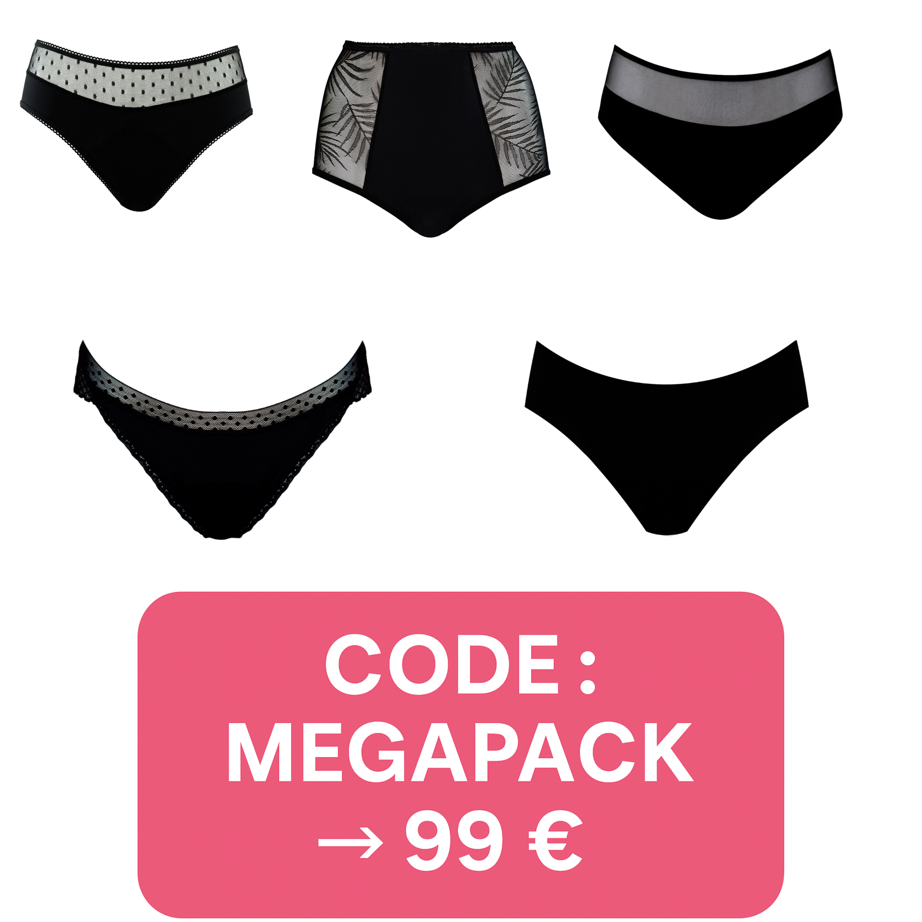 Profitez de notre pack de 5 culottes menstruelles Louloucup pour seulement 99 € au lieu de 169,50 € avec le code MEGAPACK.